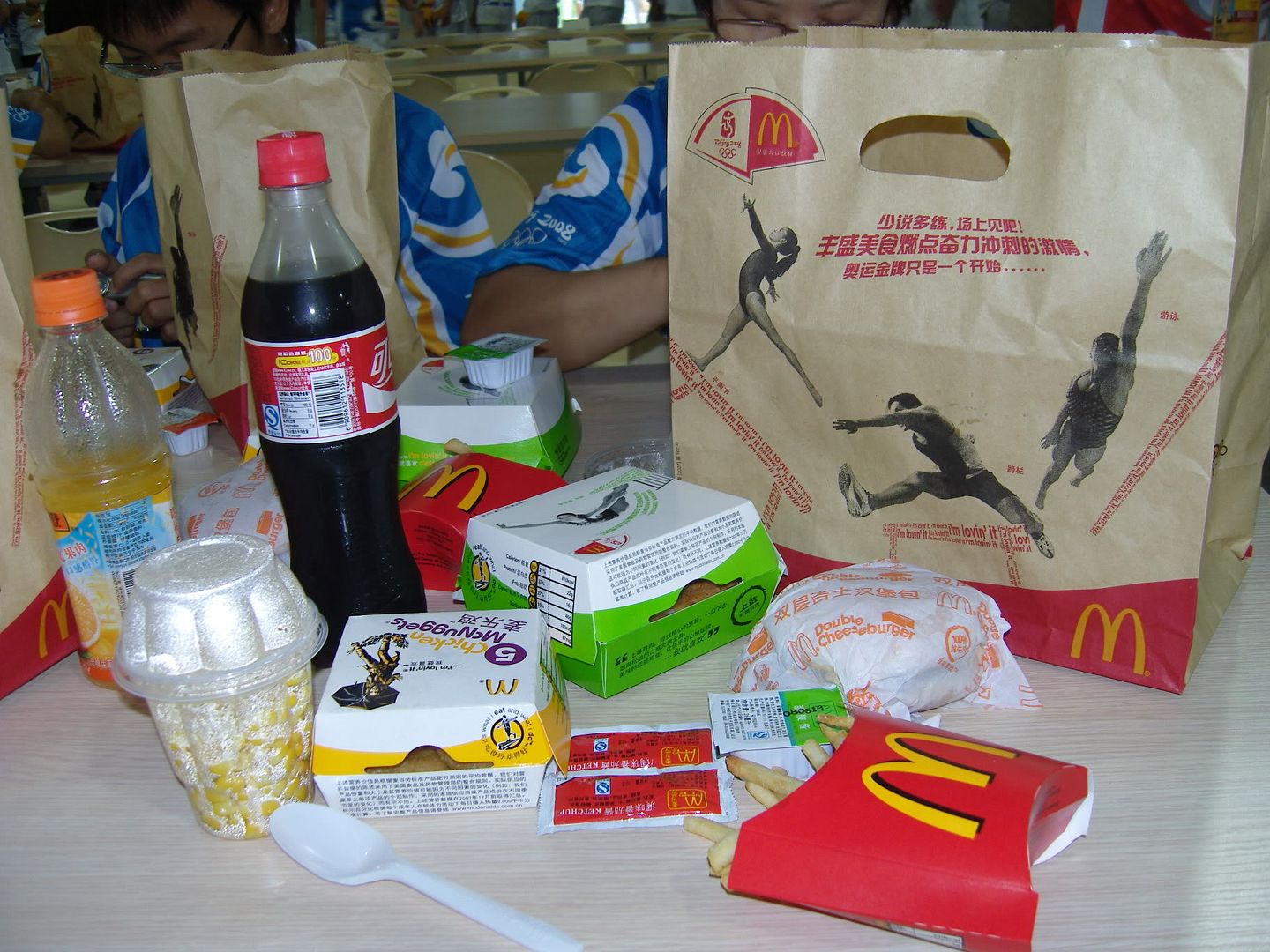 We had our first McDonald's meal today at the village. It was consisted of 6 items, a chicken burger, a double cheese burger, McNuggets, French Fries and a cup of corn, some includes apple pie as well. These are some really heavy junk....